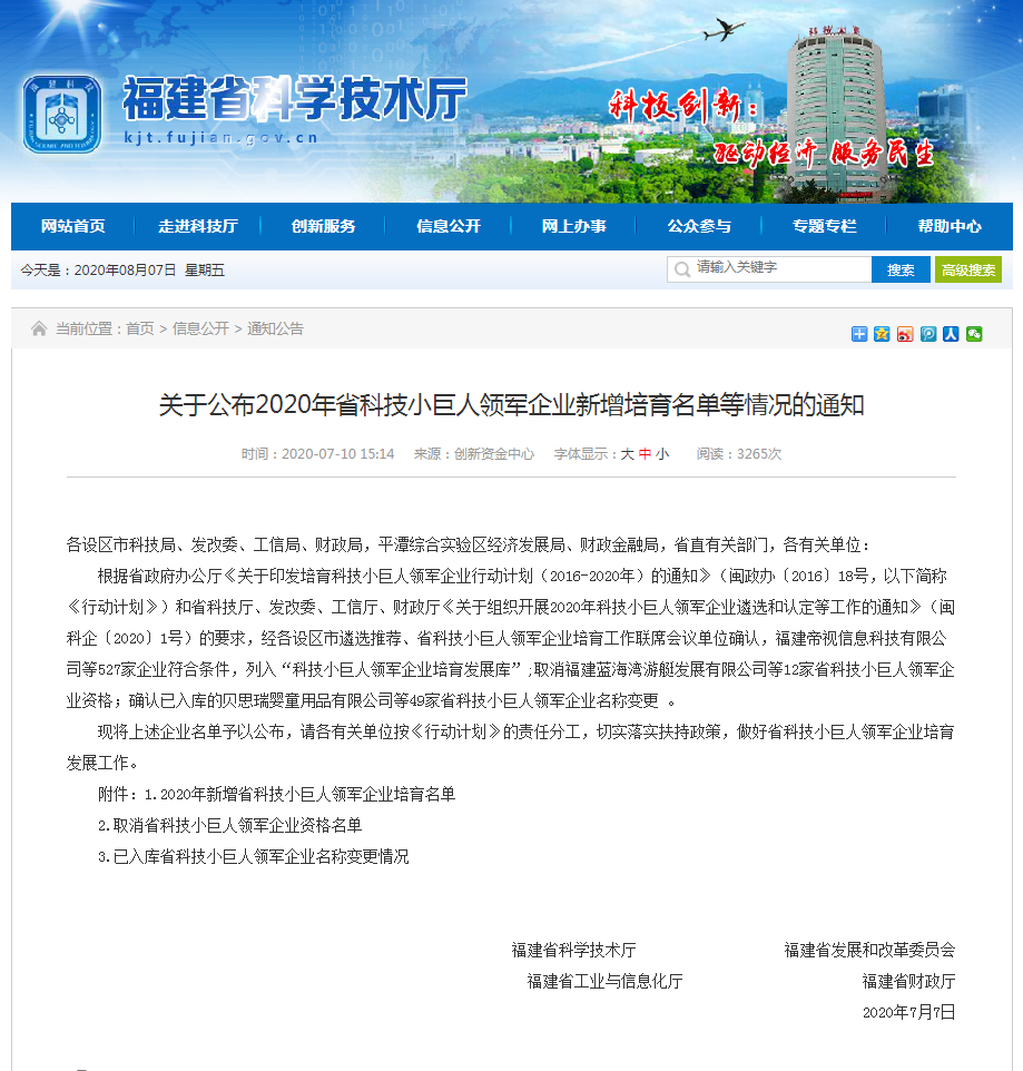 &n↕±₽☆bsp; 近(jì✔✘n)日(rì),福建省科(kē)技(jì)廳、發改委、工(gōng∞↕ו)信廳、财政廳聯合發布《關于公布2020年(nián)省科(kē)技(jì)小₩→(xiǎo)巨人(rén)領軍企業(yè)新增培育名單等情況的(de)通(tō↑✔ng)知(zhī)》,經各設區(qū)市(shì)遴選推薦、省科(kē♠↓)技(jì)小(xiǎo)巨人(rén)領≠<軍企業(yè)培育工(gōng)作(zuò)聯席會(huì)Ω∏♠ 議(yì)審核确認,廈門微信矩陣信息科技有限公司被列入“科(kē)技(jì)小(xiǎo)巨人(rén)領軍企業(yè)培™>育發展庫”。同時(shí),還(hái)入選“廈門(mén)市(shì)2020年(nián≠✘β→)科(kē)技(jì)小(xiǎo)巨人(rén)企業(yè)”。